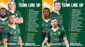 Entre los 15 titulares, el único que repite con respecto al primer partido es el segunda línea Eben Etzebeth. En el banco de suplentes estarán Malcom Marx y Vincent Koch, que también estuvieron entre los reservas al igual que el sábado. Por su parte, el héroe de la victoria por 32-29, Damian Willemse llevará la camiseta número 23 y esperará su chance entre los suplentes.