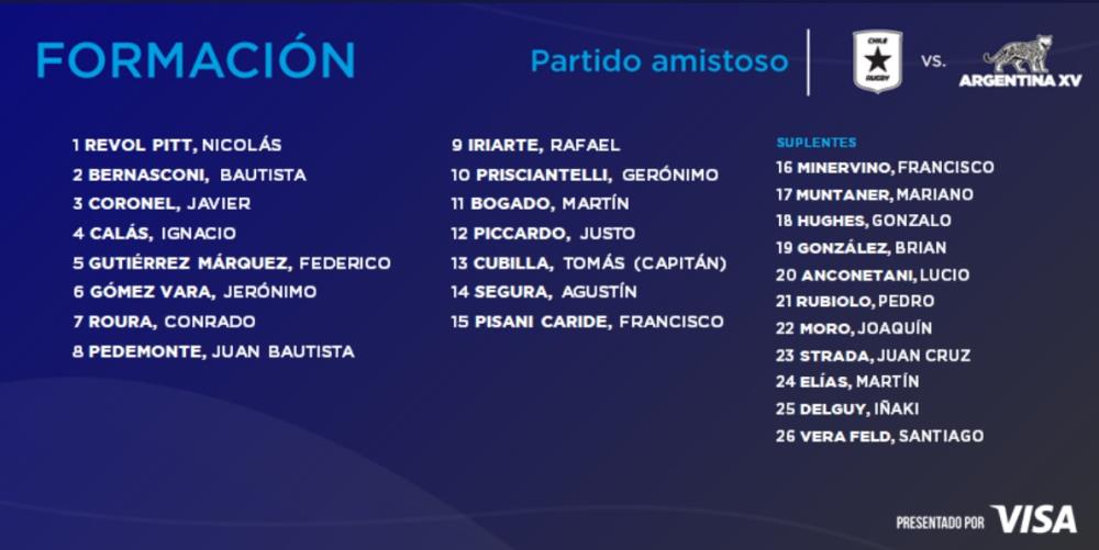 Galería de Imagenes El conjunto dirigido por Enrique Pichot enfrentará al conjunto chileno a partir de las 19hs. La pareja de medios del conjunto argentino estará integrada por el jugador de CUBA, Rafael Iriarte, y el apertura del CASI, Gerónimo Prisciantelli. El capitán del equipo será Tomás Cubilla.Jerónimo Gómez Vara estará ocupando la tercera línea junto a Conrado Roura y Juan Bautista Pedemonte. El capitán de los Pumitas viene de realizar un gran torneo con el equipo argentino en el U20 que se disputó en Sudáfrica.El partido se podrá ver a través de la plataforma Star + desde las 19hs. Acá te dejamos la formación completa del equipo dirigido por Enrique Pichot: Galería de Imagenes