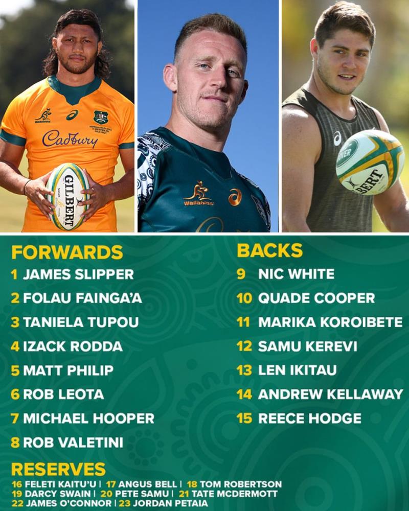De esta forma los 15 titulares de Davie Rennie serán: 1. James Slipper, 2. Folau Fainga’a, 3. Taniela Tupou; 4. Izack Rodda, 5. Matt Philip; 6. Rob Leota, 7. Michael Hooper (c), 8. Rob Valetini; 9. Nic White, 10. Quade Cooper; 11. Marika Koroibete, 12. Samu Kerevi, 13. Len Ikitau, 14. Andrew Kellaway; 15. Reece Hodge.