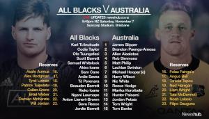 Beauden Barrett pasará de fullback a apertura, mientras que su hermano Jordie pasará de wing a utilizar la camiseta número 15 en el fondo de la cancha. El medioscrum, Brad Weber, tendrá su primera oportunidad en la serie de partidos ante los australianos y arrancará desde el banco. Por su parte, Sam Whitelock en su partido número 120 cumplirá 100 encuentros como titular, el quinto All Black en lograr este hito.