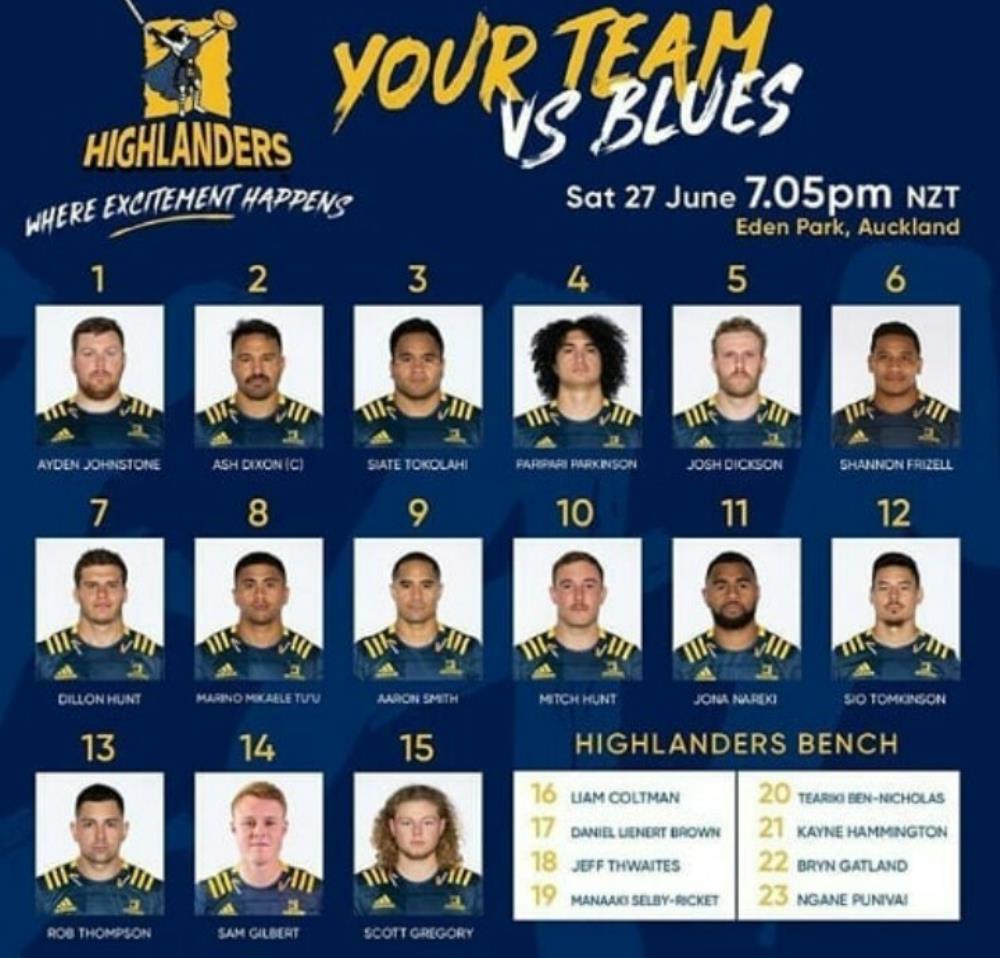 Highlanders: 1 Ayden Johnstone 2 Ash Dixon 3 Siate Tokolahi 4 Paripari Parkinson 5 Josh Dickson 6 Shannon Frizell 7 Dillon Hunt 8 Marino Mikaele Tu’u 9 Aaron Smith 10 Mitch Hunt 11 Jona Nareki 12 Patelesio Tomkinson 13 Rob Thompson 14 Sam Gilbert 15 Scott Gregory.