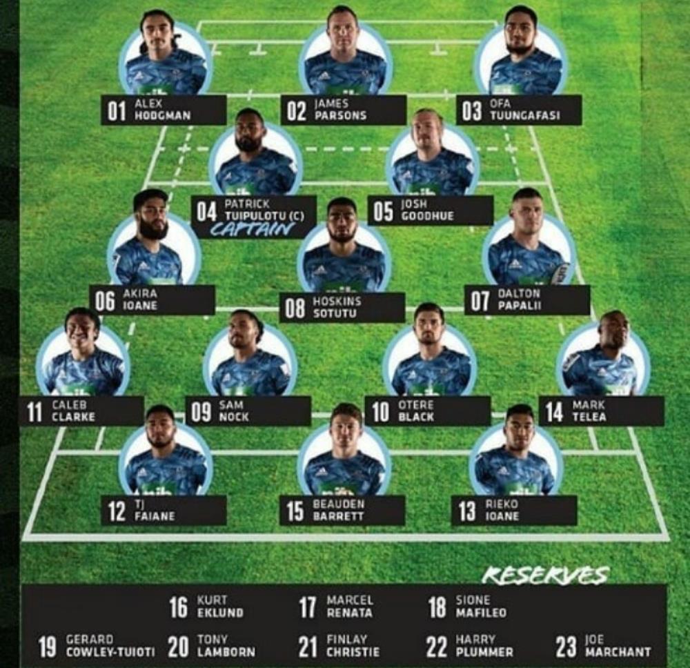 Blues: 1 Alex Hodgman 2 James Parsons 3 Ofa Tuungafasi 4 Patrick Tuipulotu 5 Josh Goodhue 6 Akira Ioane 7 Dalton Papalii 8 Hoskins Sotutu 9 Sam Nock 10 Otere Black 11 Caleb Clarke 12 TJ Faiane 13 Rieko Ioane 14 Mark Telea 15 Beauden Barrett,