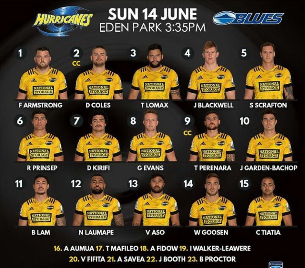 Hurricanes: 1- Fraser Armstrong 2- Dane Coles 3- Tyrel Lomax 4- James Blackwell 5- Scott Scrafton 6- Reed Prinsep 7- Du’Plessis Kirifi 8- Gareth Evans 9- TJ Perenara 10- Jackson Garden-Bachop 11- Ben Lam 12- Ngani Laumape 13- Vince Aso 14- Wes Goosen 15- Chase Tiatia.