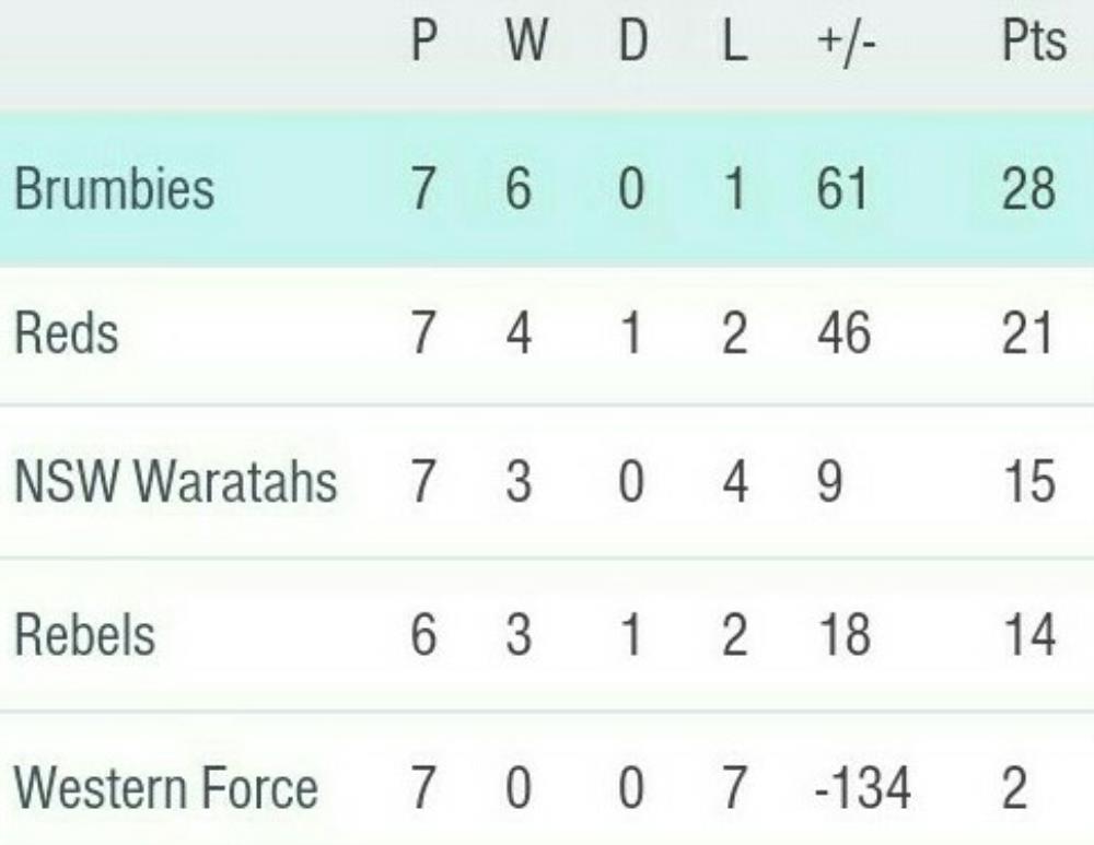 En el Gio Stadium, Brumbies superó a Western Force y espera rival para la final del torneo. Con un partido todavía por disputarse, la franquicia de Canberra se ubicó en lo más alto de la tabla de posiciones con 28 puntos y no puede ser alcanzado por ninguno de sus perseguidores. El wing Tom Wright anotó un try en la victoria de su equipo y fue uno de los puntos altos del conjunto local.