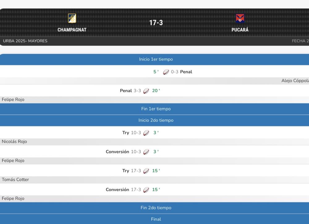 Galería de Imagenes En Estancias del Pilar, se quedó con el triunfo por 17-3 ante los de Burzaco. Pese a arrancar perdiendo desde temprano por un penal de Alejo Cóppola, el local consiguió un penal que Felipe Rojo convirtió para irse igualados en 3 al entretiempo. Ya en la segunda parte, Champagnat hizo la diferencia y logró destrabar el partido gracias a los tries de Nicolás Rojo y Tomás Cottter, ambos convertidos por Felipe Rojo para terminar quedándose con el encuentro por 17-3. Fotógrafo: Archivo RCH Fuente: RCH Galería de Imagenes