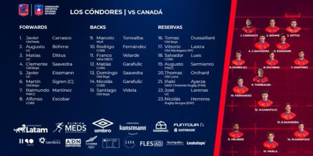 Galería de Imagenes El conjunto dirigido por Pablo Lemoine tiene confirmado los 23 jugadores que recibirán a Canadá desde las 15hs, en Valparaiso, por el partido de vuelta de las Eliminatorias Americanas rumbo a RWC 2023. El seleccionado trasandino tendrá un solo cambio respecto del equipo que visitó a Canadá la semana pasada. Javier Carrasco será el pilar izquierdo titular, mientras que Vittorio Lastra estará esperando su oportunidad en el banco de suplentes. Los Cóndores están cerca de vivir el duelo más trascendental de su historia. Luego de su caída por 22 a 21 en Norteamérica, el seleccionado chileno tendrá la oportunidad de luchar por dar vuelta el marcador ante los canadienses, y así con un triunfo soñar con el repechaje para llegar a Francia 2023. El equipo de Chile: Fotógrafo: Gentileza Rugby Chile Galería de Imagenes
