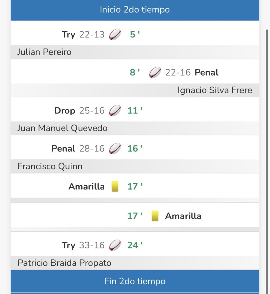 Tras muchos partidos sin poder sumar por la vía del drop, Juan Manuel Quevedo, que volvió a ser titular, recibió una pelota en el medio de la cancha y desde ahí pateó para que la ovalada se meta entre los dos postes. Seguido a eso, Francisco Quinn siguió fino con el pie y llevó el tanteador a 28-16.