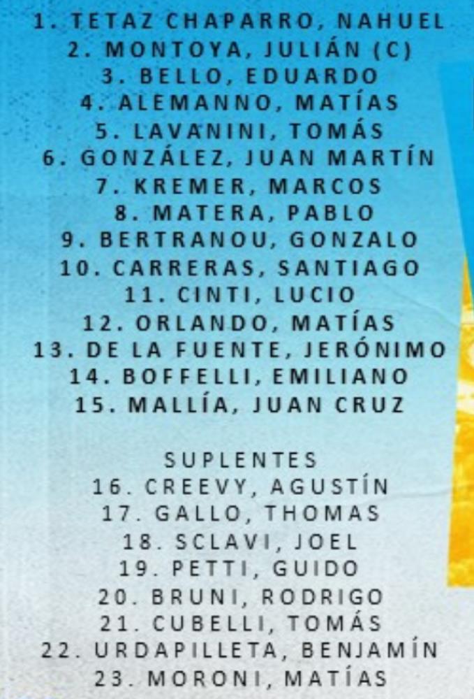 1- Tetaz Chaparro, 2- Montoya (c), 3- Bello; 4- Alemanno, 5- Lavanini; 6- González, 7- Kremer, 8- Matera; 9- Bertranou, 10- Carreras; 11- Cinti, 12- Orlando, 13- De la Fuente, 14- Boffelli, 15- Mallía