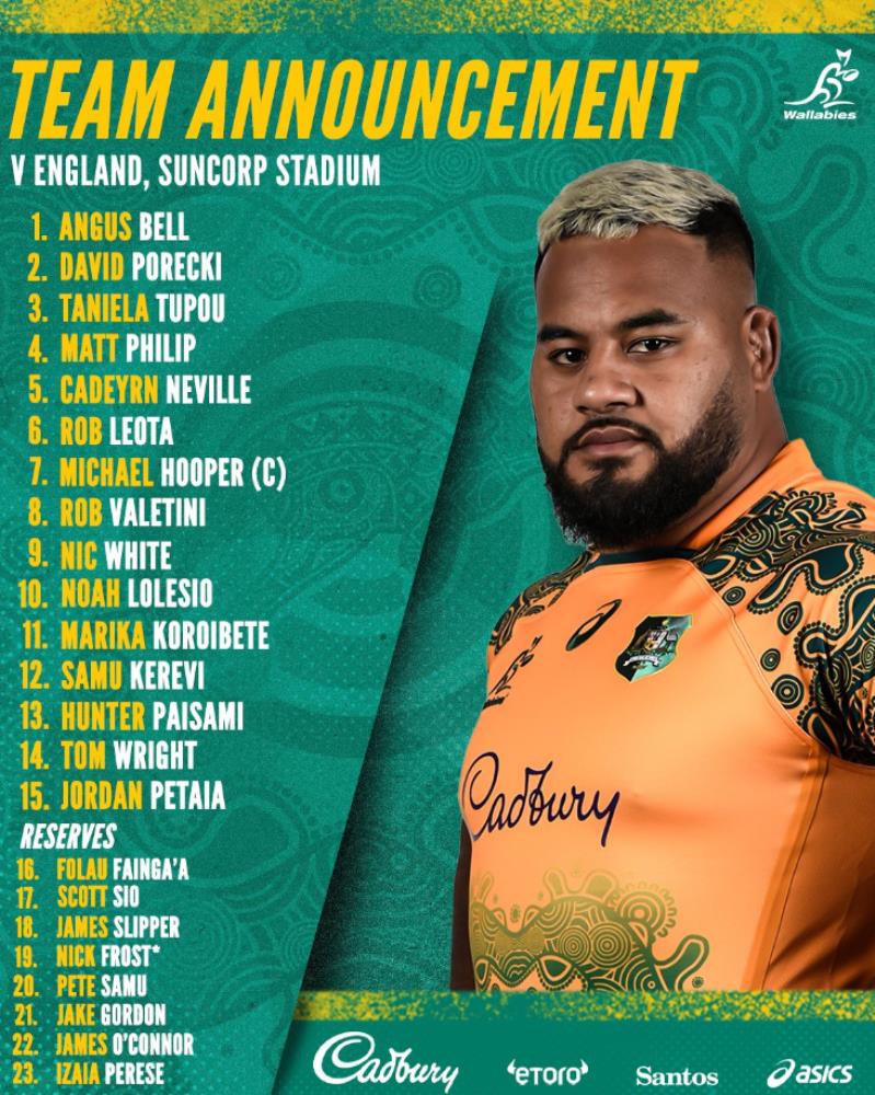 Galería de Imagenes En una semana especial para Australia por la celebración del NAIDOC, los Wallabies utilizarán una remera especial y contarán con el regreso de Taniela Tupou. Los Wallabies ya tienen equipo para jugar el segundo test match de la serie ante Inglaterra. Dave Rennie confirmó el regreso de Taniela Tupou como titular y además se vieron obligados a hacer varias modificaciones por lesión. Matt Philip entra en el equipo titular después de la suspensión de Darcy Swain por la tarjeta roja recibida tras un cabezaso y contará con Nick Frost en el banco esperando ingresar al terreno de juego para hacer su debut. Las lesiones de Tom Banks (fue operado tras una fractura en el brazo) y Andrew Kellaway (molestia en los isquiotibiales) obligaron a Rennie a remodelar la línea de los tres del fondo, es por eso que Jordan Petaia se estrenará como fullback. Además, esto permite el regreso de Tom Wright al equipo, que formará pareja de wingers con Marika Koroibete, mientras que Hunter Paisami sustituye a Len Ikitau (lesión en la pantorrilla) como segundo centro.Este sábado será un partido especial ya que los Wallabies reconocerán la semana del NAIDOC (celebración australiana que dura desde el primer domingo de julio hasta el domingo siguiente. El acrónimo NAIDOC significa Comité Nacional de Observancia del Día de los Aborígenes e Isleños) vistiendo su camiseta de las "First Nations" por primera vez en 2022. Además, cantarán el himno australiano en lengua yugambeh rindiendo homenaje a Lloyd McDermott, el primer Wallaby que se identificó como hombre de las "First Nations" (Aborígenes australianos). Fotógrafo: AU Rugby Fuente: Bautista Terrera Galería de Imagenes