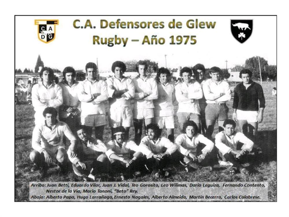 La historia del rugby en la ciudad de Glew cuenta con un antecedente de club que se autodenominó Montoneros, en referencia a las “montoneras”. La formación que agrupaba en “montones” a jugadores, no prosperó como nombre, debido a que no era “conveniente” en épocas de dictadura porque coincidía con un movimiento político-guerrillero. Entrada la década del ´70, varios miembros de Montoneros presentaron el proyecto de incluir el rugby en Defensores de Glew. La primera camiseta fue blanca con cuello y puño celeste para luego pasar a la combinación del blanco y negro, los colores que los identifican actualmente.