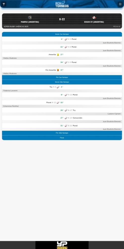 En el complemento Pampas reaccionó con un try de Federico Lavanini y un penal de Renthel. Dogos respondió con un try de intercepción de Lautaro Cipriani.Baronio aportó la conversión y sumó dos penales más para su equipo.
