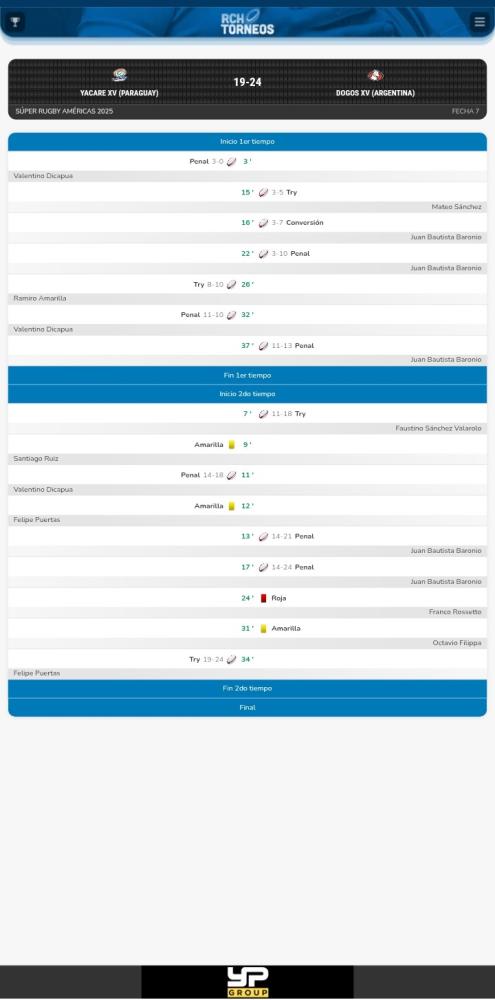 Galería de Imagenes El campeón del certamen viajó a tierras paraguayas y se trajo un importante triunfo por 24 a 19 frente a Yacaré XV en la séptima fecha del Súper Rugby Américas. Con tries de Mateo Sánchez y Faustino Sánchez Valarolo, Dogos XV cosechó una buena victoria de cara a lo que viene. Fue un partido peleado y con muchas indisciplina por parte de ambos bandos.Yacaré XV logró dos conquistas con Ramiro Amarilla y Felipe Puertas pero no le alcanzó. Se quedó cerca en el marcador pero no logró el triunfo porque no aprovechó los momentos del partido.El equipo cordobés fue prolijo y se animó a jugar como siempre. Pese a la roja de Franco Rossetto, defendió de igual a igual y se llevó lo que fue a buscar a Paraguay.Fue final y triunfo para los dirigidos por Nicolás Galatro por 24 a 19. Los jugadores destacados del equipo visitante fueron el apertura Juan Bautista Baronio. En el derrotado se destacó Valentino Dicapua.Lo mejor del partido lo encontrás en nuestra app y en nuestra web: Fotógrafo: SRA - GASPAFOTOS Fuente: BRIAN WILLCHAM Galería de Imagenes
