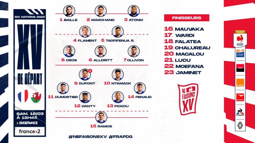 Galería de Imagenes Fabien Galthié decidió repetir equipo para la última fecha del Seis Naciones, exceptuando los lesionados Willemse y Aldegheri. Romain Taofifenua ingresará al 15 titular en lugar de Paul Willemse y estará en la segunda linea junto al exjugador de Newman Thibaud Flament. En el banco de suplentes estará Bastien Chalureau, que será opción de reemplazo en la segunda línea. Además, Aldeheri sale del equipo titular tras ser examinado por los médicos luego de un golpe sufrido en la victoria ante Inglaterra.Fabien Galthié:"Dorian Aldegheri ha sido examinado esta mañana y no está disponible. Uini (Atonio) lleva dos temporadas en la selección francesa, es un jugador que cuenta por su experiencia y sus cualidades intrínsecas. Es un lateral derecho que ahora es seguramente el mejor del mundo en su posición en el scrum. Una baza que le convierte en titular indiscutible. La inclusión de Romain Taofifenua también es lógica, ya que es nuestro número dos en la posición. Siempre ha estado presente cuando le hemos llamado. Vamos a concentrarnos en nosotros mismos, porque para ganar el torneo o poder competir, tendremos que vencer a Gales. No podemos equivocarnos de rival. Preferimos centrarnos en nuestro partido, al menos ahí tenemos el destino en nuestras manos. Después, el resto no depende de nosotros". Fuente: Bautista Terrera Galería de Imagenes
