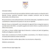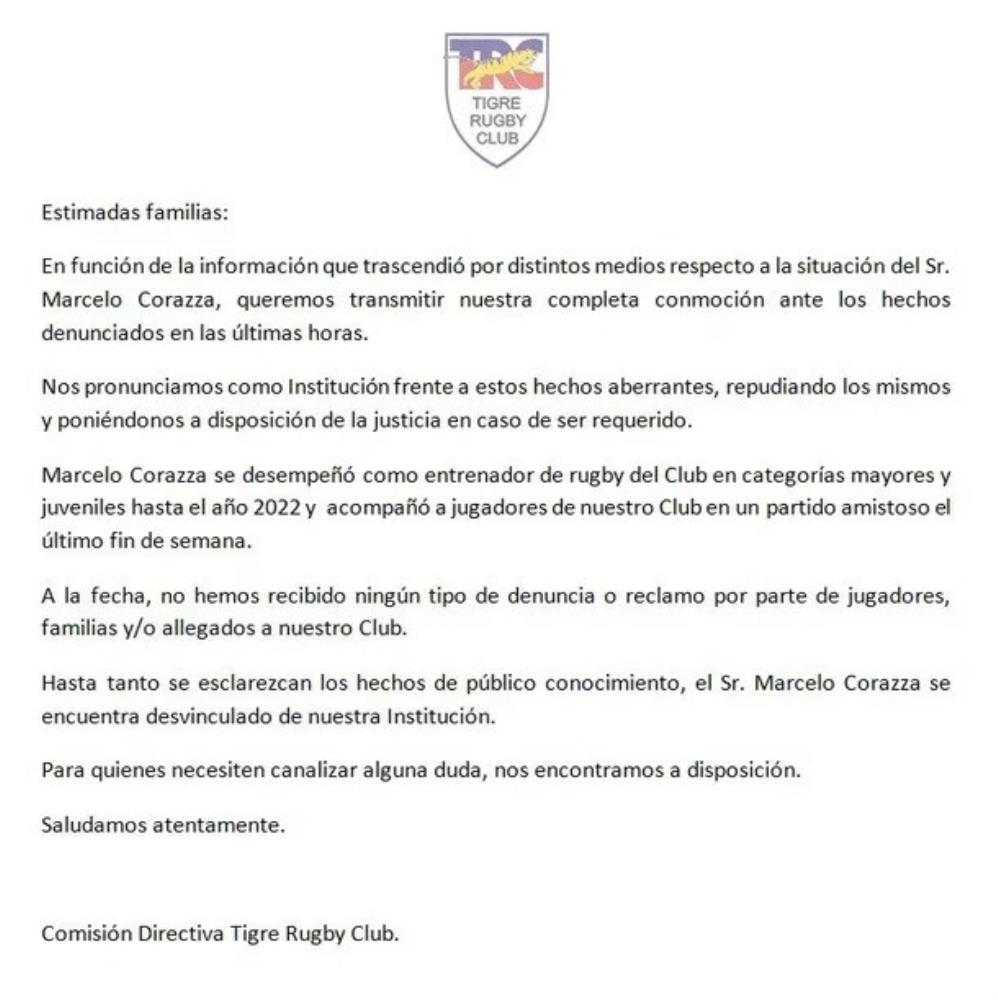 Galería de Imagenes Tigre Rugby Club publicó un comunicado tras la detención del productor de Gran Hermano en el marco de una causa por corrupción de menores. “En función de la información que trascendió por distintos medios respecto a la situación del Sr. Marcelo Corazza, queremos transmitir nuestra completa conmoción ante los hechos denunciados en las últimas horas”, comienza el comunicado del club de rugby.“Nos pronunciamos como Institución frente a estos hechos aberrantes, repudiando los mismos y poniéndonos a disposición de la Justicia en caso de ser requerido”, continuaron.En el comunicado, informaron que “Marcelo Corazza se desempeñó como entrenador de rugby del Club en categorías mayores y juveniles hasta el año 2022 y acompañó a jugadores de nuestro Club en un partido amistoso el último fin de semana”.Según indicaron desde el club de rugby donde trabajaba Corazza, “a la fecha, no hemos recibido ningún tipo de denuncia o reclamo por parte de jugadores, familias y/o allegados a nuestro Club”. Fotógrafo: Archivo RCH Fuente: Tigre Rugby Club Galería de Imagenes