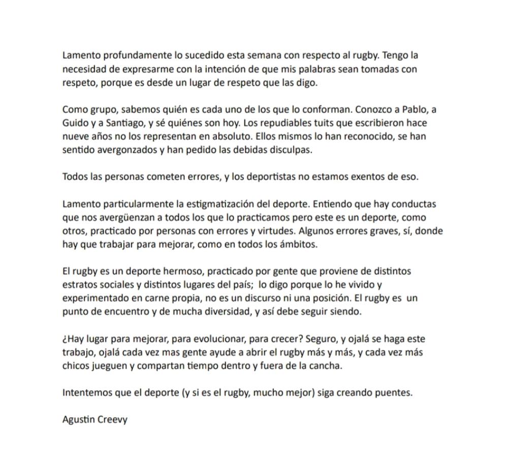 Galería de Imagenes Desde Inglaterra, Agustín Creevy escribió un carta acerca de la actualidad que viven los tres jugadores supendidos. La actualidad de Los Pumas es preocupante. El no homenajear a Diego Maradona desató las críticas al seleccionado nacional, quien grabó un video para explicar el motivo. Sin embargi, viejos tweets de jugadores desencadenaron nuevas críticas, y la UAR tomó la decisión de suspenderlos. Ante esta situación, el ex capitán, el gran ausente de este equipo, escribió una carta en apoyo a sus compañeros. La carta de Agustín Creevy: Galería de Imagenes