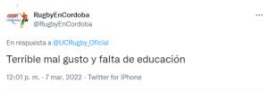 Galería de Imagenes La Unión de Rugby de Córdoba twitteó un video en alusión al título del Campeonato Argentino Juvenil. Esta mañana, la Unión Cordobesa de Rugby publicó en su cuenta de Twitter el famoso video de Guillermo Francella en el cual el actor dice "Hermosa mañana, ¿verdad?". Está claro que es un clip muy utilizado en las redes sociales luego de algún triunfo o suceso muy importante de la institución que lo publica, sin embargo, las respuestas al mismo no fueron para nada positivas. Algunas personas se quejaron diciendo que era una falta de respeto y muchas otras expresaron su repudio justificándolo con que esta no es la forma con la que la Unión debería festejar el logro de su seleccionado M18 ya que se aleja de los verdaderos valores del rugby. Minutos más tarde la publicación fue eliminada de Twitter. Fotógrafo: @UCRugby_oficial Fuente: Bautista Terrera Galería de Imagenes