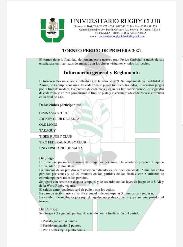 Será el reconocido Perico Carbajal 2021, en reconocimiento al recordado dirigente salteño que dejó sus enseñanzas y promovió el deporte ovalado. Lo jugarán ocho equipos divididos en dos zonas de cuatro con el protocolo covid y la modalidad tira saca en el scrum. Seis equipos serán de Salta; Taragüy de Corrientes y Old Lions de Santiago del Estero.
