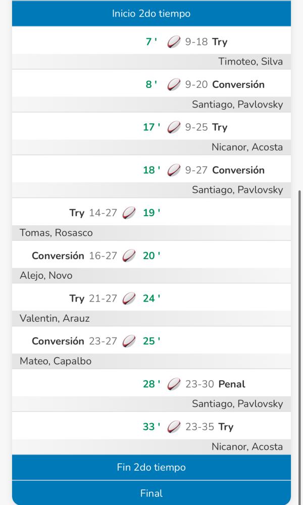 Galería de Imagenes Los de Boulogne apoyaron tres tries en el segundo tiempo para conseguir el bonus ofensivo. Buenos Aires, en cambio, no tuvo muchas respuestas, sólo una reacción para quedar 23-27 a 15m del cierre. Sin embargo, con un penal de Pavlovsky y el segundo try de Nicanor Acosta, el triunfo se lo llevó el SIC. La visita dominó los primeros veinte minutos de la segunda mitad para estirar la ventaja a 27-9; con los tries de Acosta y Silva. En cinco minutos, Biei se puso en partido con los tries de Rosasco y Arauz (27-23) para darle emoción al final; pero una última anotación por las manos de Nicanor Acosta selló la victoria para el SIC.El próximo sábado, los de San Isidro recibirán a La Plata, mientras que Biei buscará volver a ganar como visitante ante Los Tilos en Barrio Obrero.LA CRONOLOGÍA DEL PARTIDO Y EL MINUTO A MINUTO LO PODÉS SEGUIR EN VIVO EN NUESTRA APP (RCHTORNEOS) Y EN LA WEB Fotógrafo: Archivo RCH Fuente: Dante Gobbi Galería de Imagenes