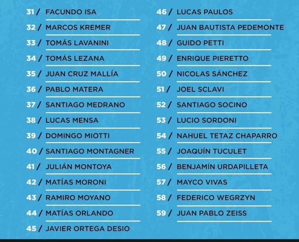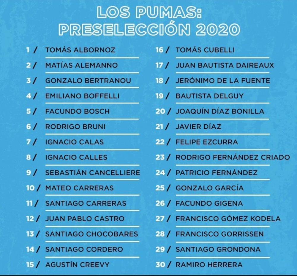 Galería de Imagenes Pese al calendario atípico que afectó al rugby de todo el mundo, Los Pumas se ponen a punto y a partir de la semana entrante comenzarán a trabajar para el futuro: en el corto plazo, en lo que podrían ser las próximas competencias internacionales y en el largo plazo, en vistas al Mundial de Francia. La primera etapa de este nuevo ciclo comenzará el próximo lunes con los jugadores que militan en Argentina, bajo la planificación del staff de preparadores físicos.La lista:1 Albornoz, Tomás2 Alemanno, Matías3 Bertranou, Gonzalo4 Boffelli, Emiliano5 Bosch, Facundo6 Bruni, Rodrigo7 Calas, Ignacio8 Calles, Ignacio9 Cancelliere, Sebastián10 Carreras, Mateo11 Carreras, Santiago12 Castro, Juan Pablo13 Chocobares, Santiago14 Cordero, Santiago15 Creevy, Agustín16 Cubelli, Tomás17 Daireaux, Juan Bautista18 De la Fuente, Jerónimo19 Delguy, Bautista20 Diaz Bonilla, Joaquín21 Díaz, Javier22 Ezcurra, Felipe23 Fernández Criado, Rodrigo24 Fernández, Patricio25 García, Gonzalo26 Gigena, Facundo27 Gómez Kodela, Francisco28 Gorrissen, Francisco29 Grondona, Santiago30 Herrera, Ramiro31 Isa, Facundo32 Kremer, Marcos33 Lavanini, Tomás34 Lezana, Tomás35 Mallía, Juan Cruz36 Matera, Pablo37 Medrano, Santiago38 Mensa, Lucas39 Miotti, Domingo40 Montagner, Santiago41 Montoya, Julián42 Moroni, Matías43 Moyano, Ramiro44 Orlando, Matías45 Ortega Desio, Javier46 Paulos, Lucas47 Pedemonte, Juan Bautista48 Petti, Guido49 Pieretto, Enrique50 Sánchez, Nicolás51 Sclavi, Joel52 Socino, Santiago53 Sordoni, Lucio54 Tetaz Chaparro, Nahuel55 Tuculet, Joaquín56 Urdapilleta, Benjamín57 Vivas, Mayco58 Wegrzyn, Federico59 Zeiss, Juan Pablo Fuente: Prensa UAR Galería de Imagenes