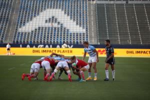 Galería de Imagenes Perdieron por 21 a 14 con el rival del debut, el que le había hecho más fuerza (21-19), quien se tomó la revancha quitándole el invicto. Con un primer tiempo en donde el calor no aflojó, más de 34 grados, Los Pumas Sevens hicieron un gran esfuerzo ante un rival que no les dio respiro y con su sólida defensa impidió cada intento del equipo argentino. El marcador lo abrió Gran Bretaña aunque el empate llegó a través de Marcos Moneta y la conversión de Santiago Mare, Así se fueron al descanso con una igualdad y el tanteador empatado en 7 tantos.Ya en la segunda mitad, el elenco de Santiago Gómez Cora no pudo controlar el balón, y Gran Bretaña tomó el control apoyando un nuevo try en el ingoal argentino. Los Pumas Sevens consiguieron apoyar también a través de González Rizzoni y convertir por Bazán Vélez para igualar en 14. La ventaja y la definición del match llegó a través de un excelente try de Mitchel y allí le quedo a Argentina la última para tratar de igualar. A 18 segundos del final un dudoso tackle alto de Bazán Vélez dejó al elenco nacional con un jugador menos que finalmente aprovechó su rival para hacer correr el reloj y terminar el pleito Gran Bretaña se llevó el match y el invicto argentino con el resultado 21 a 14 y su esperada revancha del partido del debut. Galería de Imagenes
