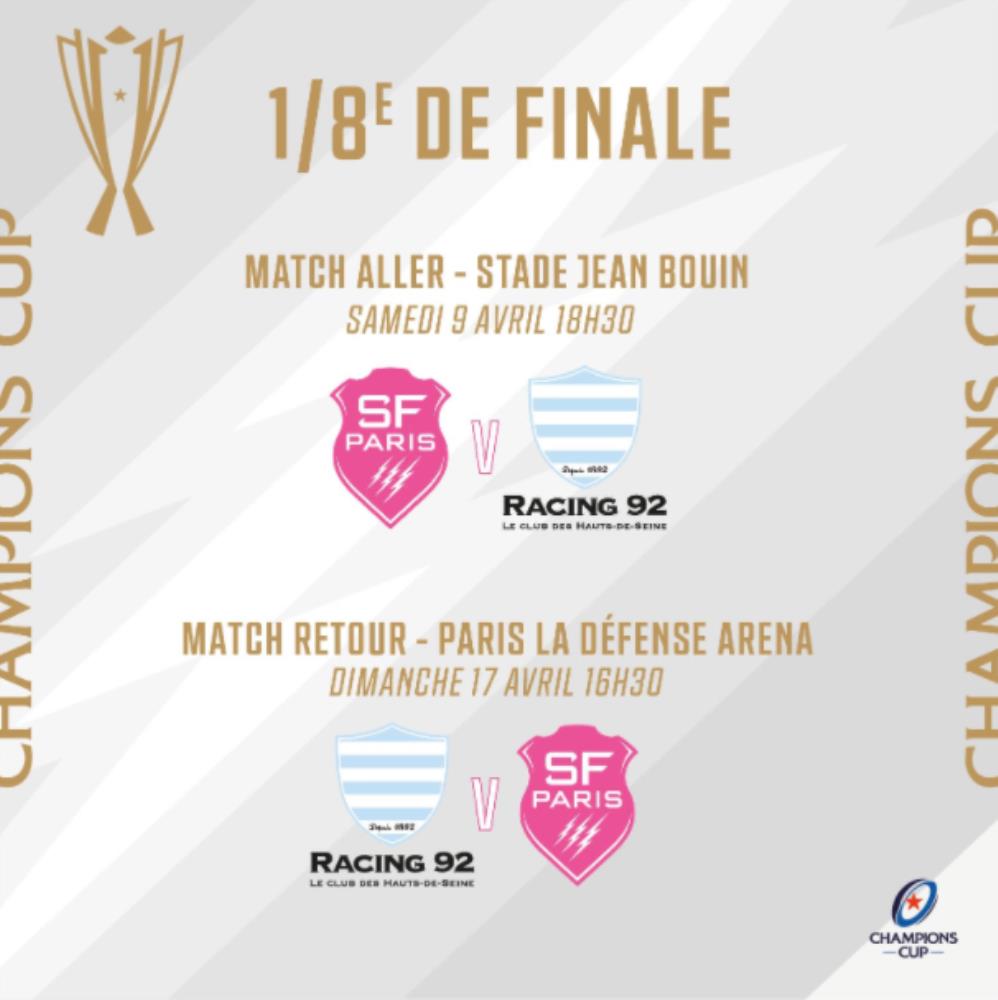 La Copa de Campeones de Europa comienza su etapa de definición y por los Octavos de Final se dará un cruce que cautivará todas las miradas, Stade Français Vs. Racing 92. En primer turno, el equipo dirigido por Gonzalo Quesada y que tiene en sus filas a dos argentinos, Marcos Kremer y Nicolás Sánchez, recibirá en el Stade Jean Bouin a su clásico rival celeste y blanco.