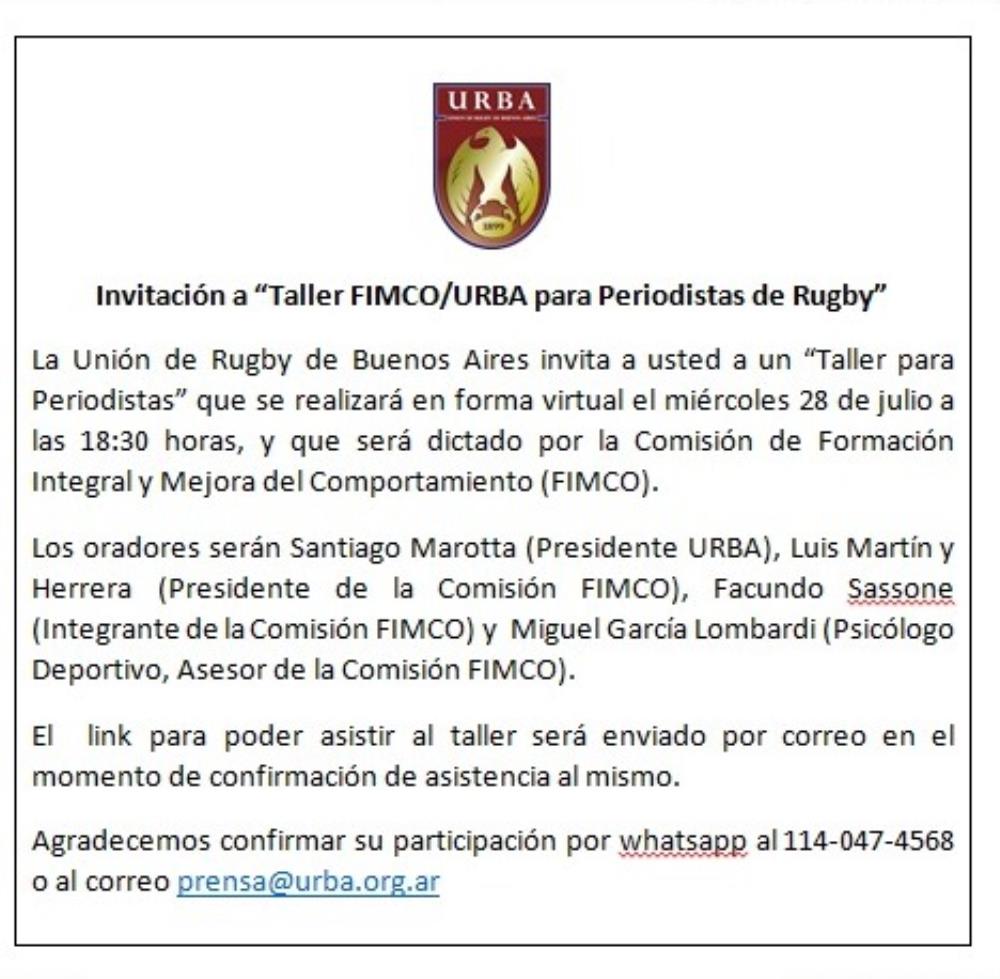 Galería de Imagenes Junto a la URBA, la Comisión encargada de trabajar la violencia en el deporte dictará un taller para los trabajadores de los medios de comunicación en el día miércoles 28 de julio. Será de manera virtual a partir de las 18:30 horas. Los encargados de llevar adelante el taller serán Santiago Marotta, presidente de la URBA, Luis Martín y Herrera, presidente de FIMCO, Facundo Sassone, integrante de FIMCO, y Miguel García Lombardi, psicólogo deportivo. La invitación que realizó la URBA junto a FIMCO: Fotógrafo: URBA Galería de Imagenes
