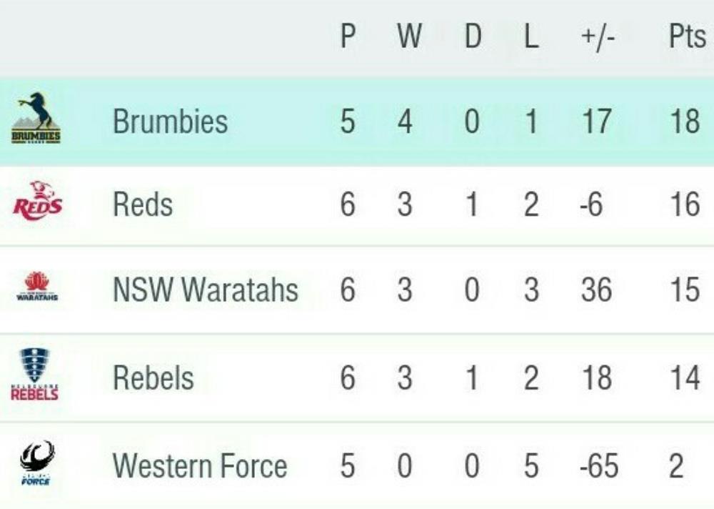 Galería de Imagenes Western Force recibirá a Reds mientras que Brumbies protagonizará el duelo de la fecha frente a Waratahs. El único equipo que todavía no logró un triunfo en el torneo tendrá enfrente al escolta del torneo que viene en un buen momento y con la oportunidad de pelearle el campeonato a Brumbies. Western Force recibirá a los de Brisbane e intentará cortar la mala racha. El equipo que tiene a James O´Connor como apertura viene de superar la semana pasada a Rebels e intentará ser uno de los animadores del torneo australiano hasta el final.El duelo clave se jugará en Canberra, donde Brumbies estará enfrentando a Waratahs. El dueño de casa tuvo descanso la semana pasada e intentará conseguir un triunfo para mantenerse en lo más alto. Michael Hooper, que cumplió 150 partidos en el Súper Rugby el último fin de semana, y compañía deberán hacer todo lo posible para robarle un triunfo en condición de visitante a su rival para mantener emotivo el certamen. Acá te dejamos las formaciones de los equipos y la tabla de posiciones: Fotógrafo: rugby.com.au Galería de Imagenes