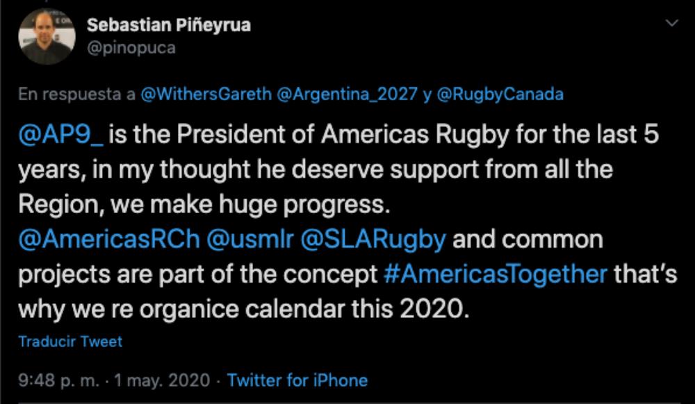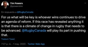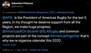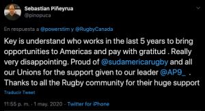Galería de Imagenes En horas donde se especula el voto de varios uniones que serán claves en la definición del nuevo Presidente de World Rugby, la decisión de los canadienses de apoyar a Beaumont está dando que hablar. Rugby Canadá emitió un comunicado, firmado por su Presidente y donde revelan su apoyo a la candidatura a Bill Beaumont: "Creemos que aportará un compromiso para el progreso en nuestras áreas de preocupación, al mismo tiempo que ofrecerá la estabilidad necesaria". Entre otras cosas, expresan su deseo de achicar diferencias entre el Tier 1 y 2, tanto económico como deportivo, además de un mayor apoyo al rugby femenino, justamente las propuestas mas fuertes de Agustín Pichot, del que reconocieron sus energías puestas en su candidatura y aclararon sus intenciones de seguir trabajando junto a él.Tim Powers, el Presidente de Rugby Canadá, se expresó en Twitter: "Para nosotros es clave que quien gane continúe impulsando una agenda de reformas. Si hay algo que reveló esta carrera es que hay un clima de cambio en el rugby, necesita avanzar y nosotros jugaremos nuestra parte en impulsar eso". Quien le salió al cruce fue Sebastián Piñeyrua, Presidente de Sudamérica Rugby: "La clave es entender quien trabaja en los últimos 5 años para brindar oportunidades a América y pagar con gratitud, es realmente muy decepcionante. Estoy orgulloso de nuestras uniones por el apoyo brindado a nuestro líder Agustín Pichot".Piñeyrua expresó su descontento en otro twit y marcó: "Agustín Pichot es el Presidente de Américas Rugby, en mi opinión merece el apoyo de toda la región, hicimos grandes progresos. Americas Rugby Championship, la Mayor League Rugby y la Superliga Americana son proyectos comunes y por eso habíamos reorganizado el calendario 2020".El comunicado de los canadienses desató el enojo e indignación también en muchos fanáticos del rugby, que expresaron su descontento como respuesta al twit subido. Ver en: https://twitter.com/RugbyCanada/status/1256342705837355008?s=20 Galería de Imagenes