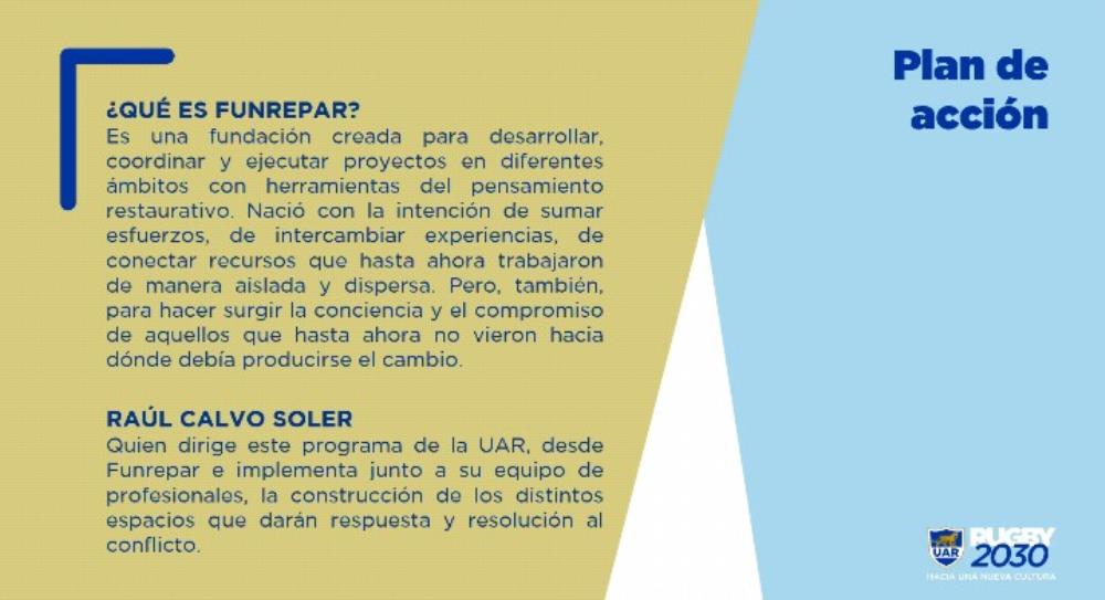 Por su parte, cabe destacar que la UAR liderará esta iniciativa inédita, compleja y disruptiva, junto a Funrepar, organización experta en resolución de conflictos, desde una visión y concepción de la filosofía restaurativa. Si bien el acuerdo inicial con esta institución es por dos años, el programa mencionado es un plan muy ambicioso de mediano y largo plazo que tiene como objetivo final instalar una nueva cultura en nuestro deporte. Se llevaron a cabo reuniones virtuales junto a las 25 uniones afiliadas y más de 400 clubes de todo el país, donde se establecieron las pautas de trabajo y donde cada una designó un referente para avanzar con la iniciativa.