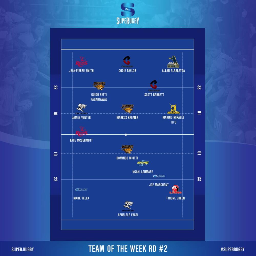 Equipo: 1-Jean-Pierre Smith (Reds), 2- Codie Taylor (Crusaders), 3- Allan Alaalatoa (Brumbies), 4- Guido Petti (Jaguares), 5- Scott Barrett (Crusaders), 6- James Venter (Sharks), 7- Marcos Kremer (Jaguares), 8- Marino Mikaele Tu'u (Highlanders), 9- Tate McDermott (Reds), 10- Domingo Miotti (Jaguares), 11- Mark Telea (Blues), 12- Ngani Laumape (Hurricanes), 13- Joe Marchant (Blues), 14- Tyrone Green (Lions), 15- Aphelele Fassi (Sharks).