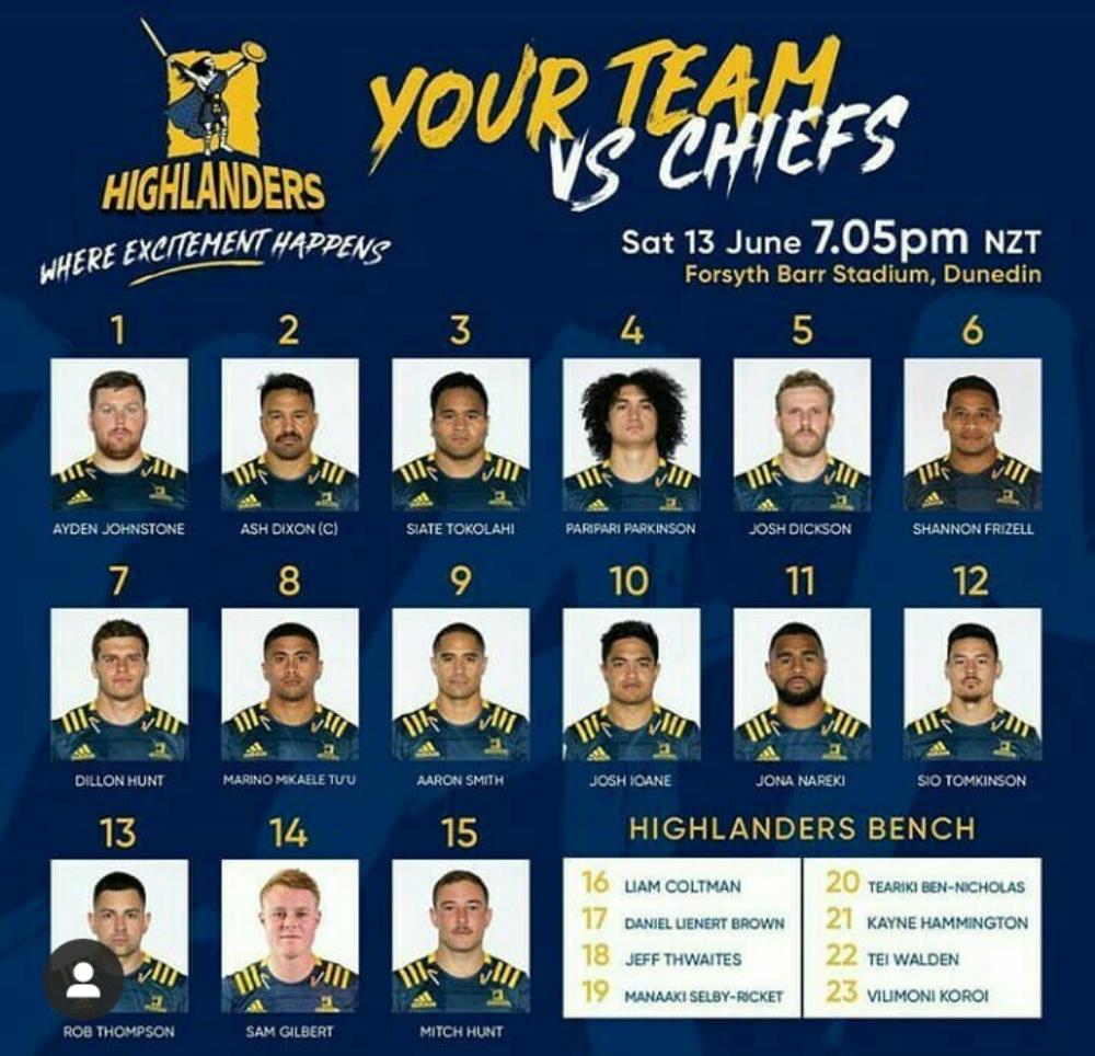 Galería de Imagenes El inicio del Super Rugby Aotearoa será el día sábado en Dunedin El duelo comenzará a las 4AM del sábado y se podrá ver en vivo por ESPN Play y en diferido a las 22 por ESPN 3.A continuación te dejamos las formaciones de ambos equipos:Chiefs: 1- Aidan Ross 2- Samisoni Taukei’aho 3- Nepo Laulala 4- Mitchell Brown 5- Tupou Vaa’I 6- Luke Jacobson 7- Lachlan Boshier 8- Pita Gus Sowakula 9- Brad Weber 10- Kaleb Trask 11- Sean Wainui 12- Anton Lienert-Brown 13- Quinn Tupaea 14- Shaun Stevenson 15- Damian McKenzie.Suplentes: 16- Bradley Slater 17- Ryan Coxon 18- Ross Geldenhuys 19- Naitoa Ah Kuoi 20- Dylan Nel 21- Te Toiroa Tahuriorangi 22- Aaron Cruden 23- Etene Nanai-Seturo.Highlanders: 1- Ayden Johnstone 2- Ash Dixon 3- Siate Tokolahi 4- Pari Pari Parkinson 5- Josh Dickson 6- Shannon Frizzell 7- Dillon Hunt 8- Marino Mikaele Tu’u 9- Aaron Smith 10- Josh Ioane 11- Jona Nareki 12- Patelesio Tomkinson 13- Rob Thompson 14- Sam Gilbert 15- Mitch Hunt.Suplentes: 16- Liam Coltman 17- Daniel Lienert-Brown 18- Jeff Thwaites 19- Manaaki Selby-Rickit 20- Teariki Ben-Nicholas 21- Kayne Hammington 22- Teihorangi Walden 23- Vilimoni Koroi. Fotógrafo: Instagram oficial de Highlanders y Chiefs Galería de Imagenes