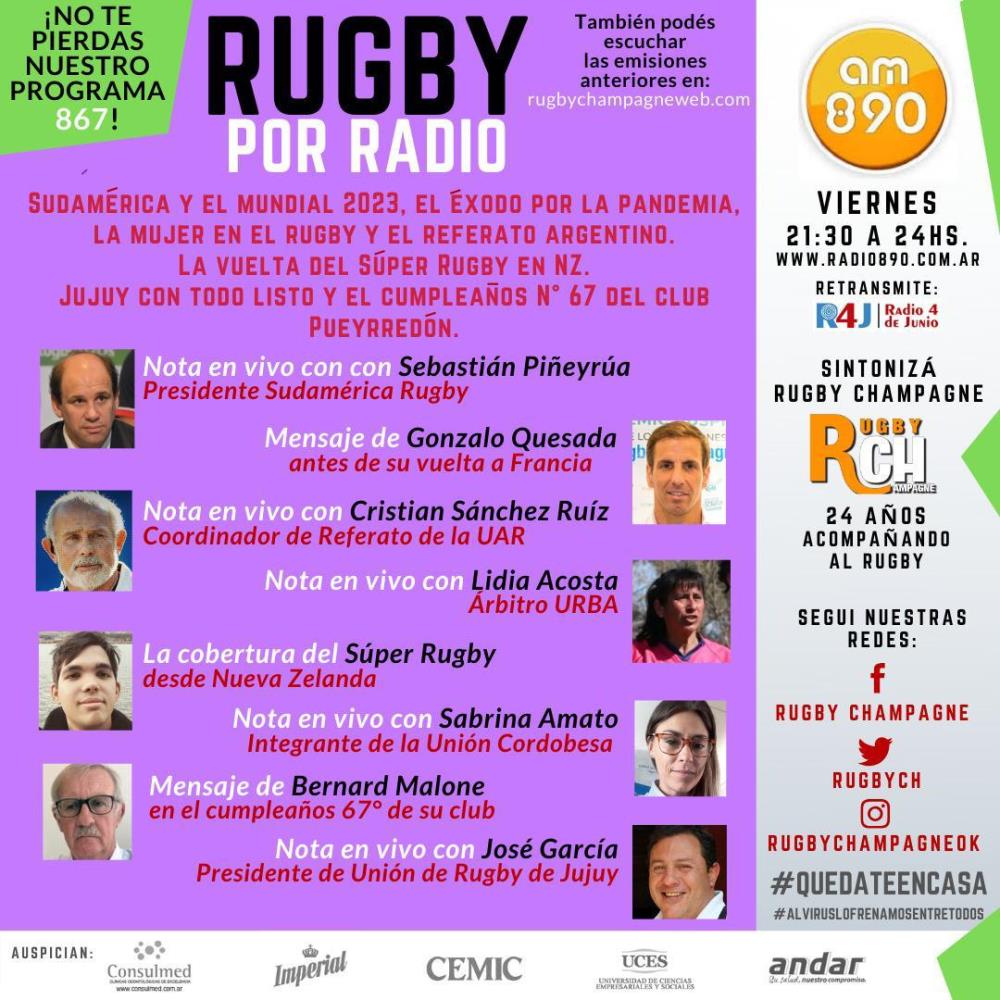 Galería de Imagenes Desde las 21.30 hasta las 24 por Radio Libre AM890, el canal de Youtube de Radio Libre, la Radio 4 de Junio y todas sus repetidoras. En el programa 867 hablaremos sobre Sudamérica y el Mundial 2023, el éxodo por la pandemia, la mujer en el rugby y el referato argentino.Además, todo sobre la vuelta del Super Rugby en Nueva Zelanda, el regreso de la actividad en la provincia de Jujuy y el cumpleaños N°67 del club Peuyrredón.Notas en vivo con Sebastián Piñeyrúa (Presidente de Sudámerica Rugby), Cristian "El Mono" Sánchez Ruíz (Coordinador de Referato de la UAR), Lidia Acosta (árbitro URBA), Sabrina Amato (Integrante de la Unión Cordobes) y José García (Presidente de la Unión de Rugby de Jujuy). Tendremos mensajes de Gonzalo Quesada, antes de su vuelta a Francia, y de Bernard Malona, en el cumpleaños 67° de su club. Y la cobertura del Super Rugby con nuestro corresponsal desde Nueva Zelanda, Santiago Ángel.Te esperamos! Galería de Imagenes
