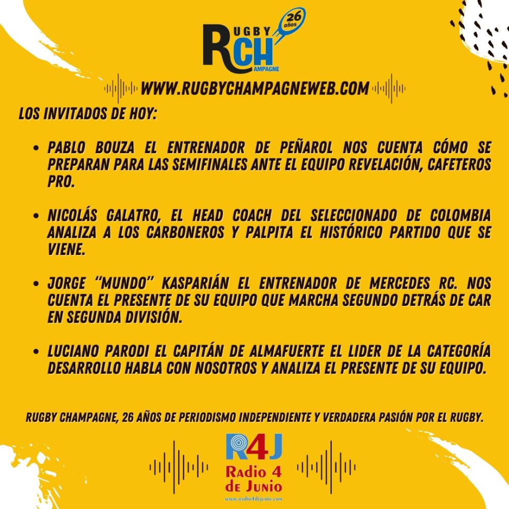 Galería de Imagenes En el día del Censo Nacional te esperamos desde las 18 para compartir la información del deporte ovalado y las mejores entrevistas. LOS INVITADOS DE HOY: PABLO BOUZA EL ENTRENADOR DE PEÑAROL NOS CUENTA COMO SE PREPARAN PARA LAS SEMIFINALES ANTE EL EQUIPO REVELACION, CAFETEROS PRO// NICOLÁS GALATRO, EL HEAD COACH DEL SELECCIONADO DE COLOMBIA ANALIZA A LOS CARBONEROS Y PALPITA EL HISTÓRICO PARTIDO QUE SE VIENE// JORGE “MUNDO” KASPARIÁN EL ENTRENADOR DE MERCEDES RC. NOS CUENTA EL PRESENTE DE SU EQUIPO QUE MARCHA SEGUNDO DETRÁS DE CAR EN SEGUNDA DIVISION // LUCIANO PARODI EL CAPITÁN DE ALMAFUERTE EL EQUIPO LIDER DE LA CATEGORÍA DESARROLLO HABLA CON NOSOTROS Y NOS ANALIZA EL PRESENTE DE SU EQUIPO.RUGBY CHAMPAGNE, 26 AÑOS DE PERIODISMO INDEPENDIENTE Y VERDADERA PASIÓN POR EL RUGBY. Galería de Imagenes