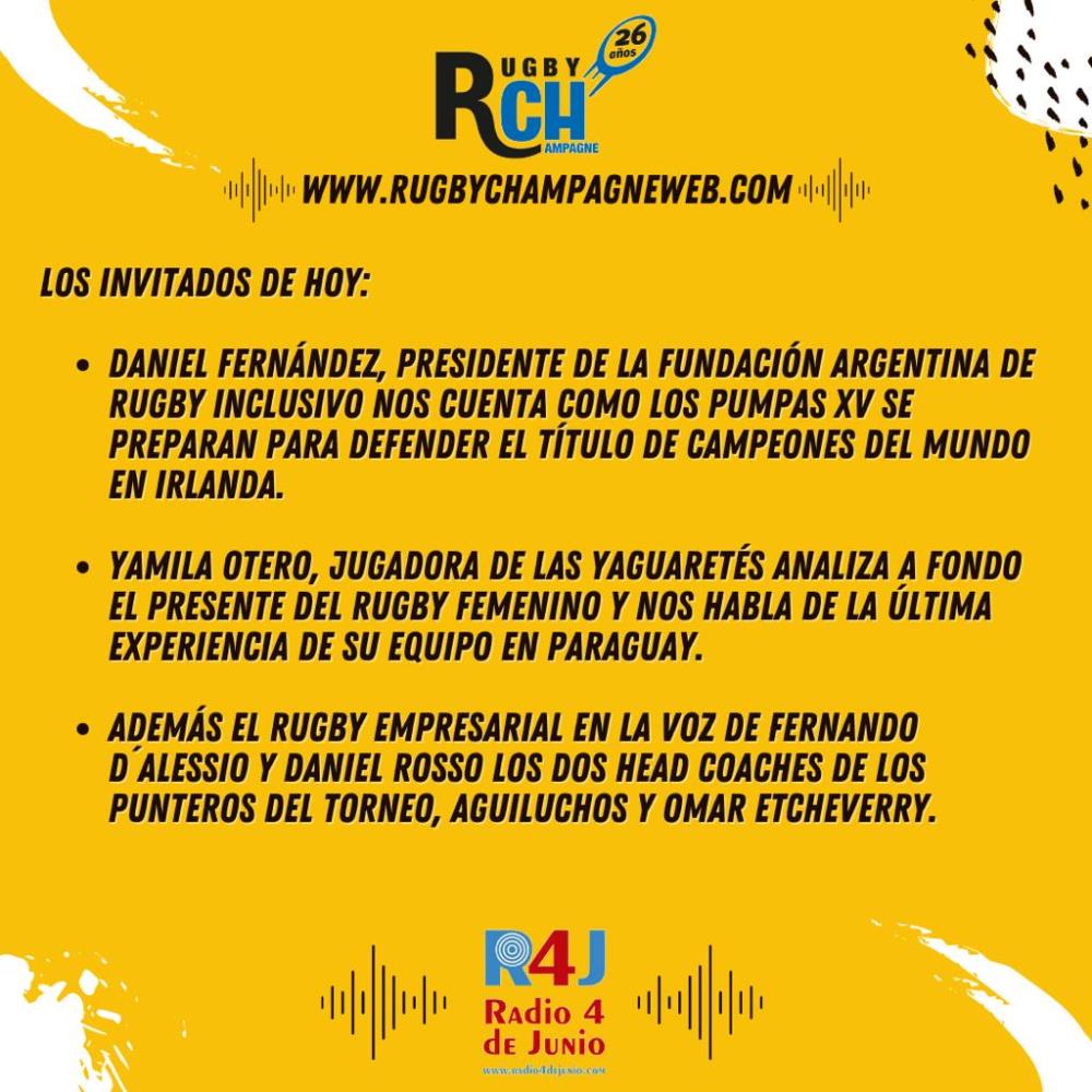 Galería de Imagenes En horario especial, de 17 a 19hs, te traemos toda la información del deporte ovalado y las mejores entrevistas. LOS INVITADOS DE HOY: DANIEL FERNÁNDEZ EL PRESIDENTE DE LA FUNDACIÓN ARGENTINA DE RUGBY INCLUSIVO NOS CUENTA COMO LOS PUMPAS XV SE PREPARAN PARA DEFENDER EL TÍTULO DE CAMPEONES DEL MUNDO EN IRLANDA // YAMILA OTERO JUGADORA DE LAS YAGUARETÉS ANALIZA A FONDO EL PRESENTE DEL RUGBY FEMENINO Y NOS HABLA DE LA ÚLTIMA EXPERIENCIA DE SU EQUIPO EN PARAGUAY // ADEMÁS EL RUGBY EMPRESARIAL EN LA VOZ DE FERNANDO D´ALESSIO Y DANIEL ROSSO LOS DOS HEAD COACHES DE LOS PUNTEROS DEL TORNEO, AGUILUCHOS Y DORREGO RUGBY (OMAR ETCHEVERRY).RUGBY CHAMPAGNE, 26 AÑOS DE PERIODISMO INDEPENDIENTE Y VERDADERA PASIÓN POR EL RUGBY. Fotógrafo: Archivo RCH Fuente: Jorge Ciccodicola Galería de Imagenes
