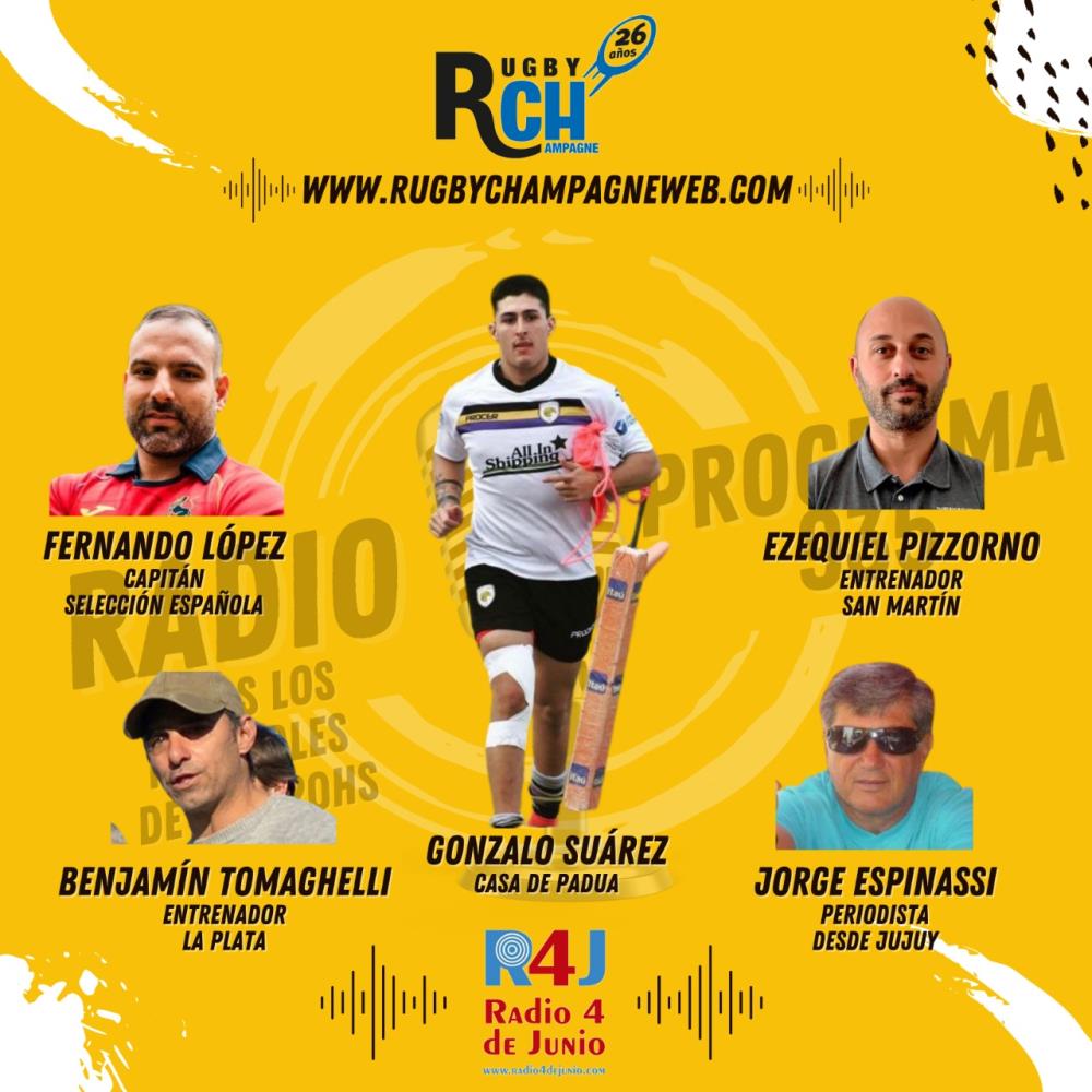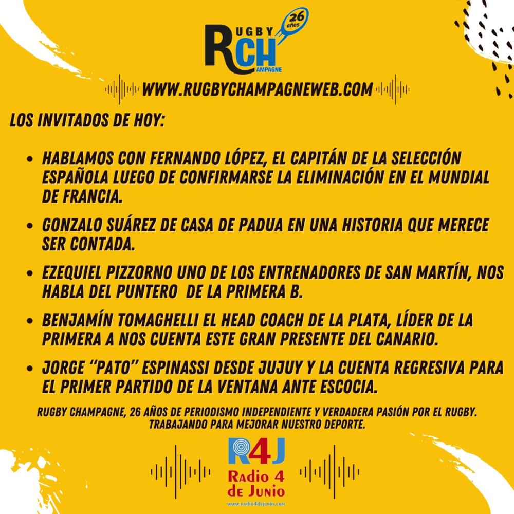 Galería de Imagenes Te esperamos con toda la información del deporte ovalado y las mejores entrevistas desde las 18hs. LOS INVITADOS DE HOY: HABLAMOS CON FERNANDO LÓPEZ, EL CAPITÁN DE LA SELECCIÓN ESPAÑOLA LUEGO DE CONFIRMARSE LA ELIMINACIÓN EN EL MUNDIAL DE FRANCIA // GONZALO SUÁREZ DE CASA DE PADUA EN UNA HISTORIA QUE MERECE SER CONTADA // EZEQUIEL PIZZORNO UNO DE LOS ENTRENADORES DE SAN MARTÍN, NOS HABLA DEL PUNTERO DE LA PRIMERA B // BENJAMÍN TOMAGHELLI EL HEAD COACH DE LA PLATA, LIDER DE LA PRIMERA A NOS CUENTA ESTE GRAN PRESENTE DEL CANARIO// JORGE “PATO” ESPINASSI DESDE JUJUY Y LA CUENTA REGRESIVA PARA EL PRIMER PARTIDO DE LA VENTANA ANTE ESCOCIA. RUGBY CHAMPAGNE, 26 AÑOS DE PERIODISMO INDEPENDIENTE Y VERDADERA PASIÓN POR EL RUGBY. TRABAJANDO PARA MEJORAR NUESTRO DEPORTE. Galería de Imagenes
