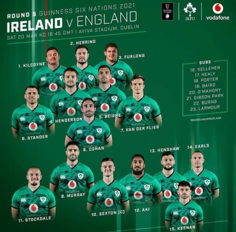 Reemplazos: 16. Ronan Kelleher, 17. Cian Healy, 18. Andrew Porter, 19. Ryan Baird, 20. Peter O'Mahony, 21. Jamison Gibson-Park, 22. Billy Burns, 23. Jordan Larmour