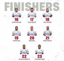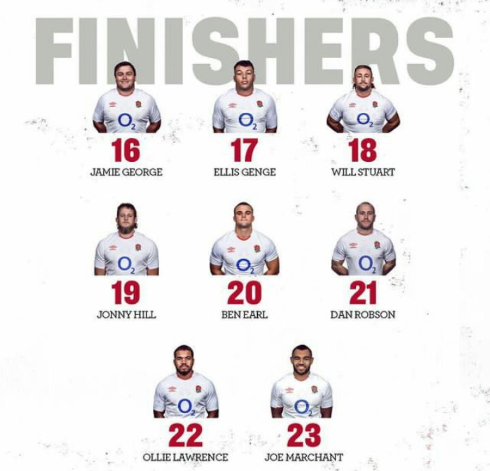 Reemplazos: 16. Jamie George, 17. Ellis Genge, 18. Will Stuart, 19. Jonny Hill, 20. Ben Earl, 21. Dan Robson, 22. Ollie Lawrence, 23. Joe Marchant.