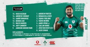 Joey Carbery será su reemplazante, haciendo su debut como titular en el Seis Naciones y formará pareja de medios con Jamison Gibson Park, que tuvo un excelente partido ante Gales.