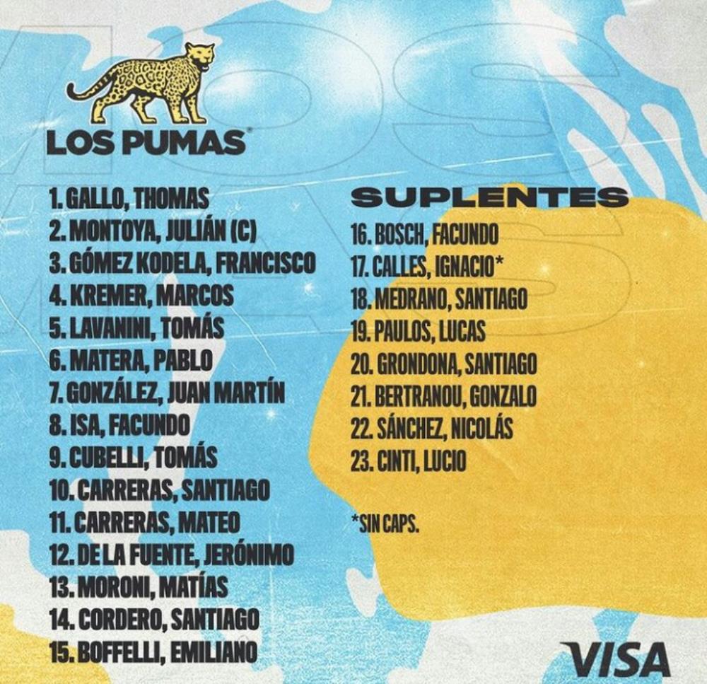 GALLO, Thomas, 2. MONTOYA, Julián (capitán) y 3. GÓMEZ KODELA, Francisco; 4. KREMER, Marcos y 5. LAVANINI, Tomás; 6. MATERA, Pablo, 7. GONZÁLEZ, Juan Martín y 8. ISA, Facundo; 9. CUBELLI, Tomás y 10. CARRERAS, Santiago; 11. CARRERAS, Mateo, 12. DE LA FUENTE, Jerónimo, 13. MORONI, Matías y 14. CORDERO, Santiago; 15. BOFFELLI, Emiliano.
