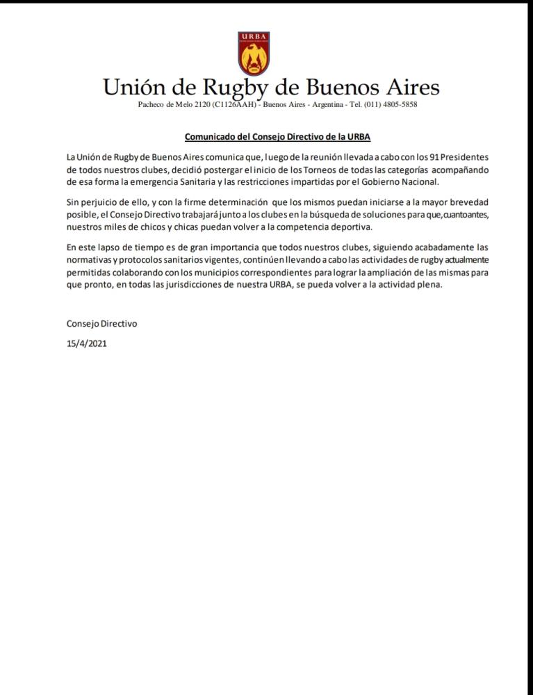 Galería de Imagenes Tal como anticipó Rugby Champagne en horas de la tarde, la Unión de Rugby de Buenos Aires tomó la decisión de postergar el inicio de los torneo hasta nuevo aviso. La reunión que mantuvieron los directivos de la URBA y los dirigentes de los 91 clubes tuvieron los resultados previsibles. La segunda ola de contagios del COVID-19 azota al país lo que hace que el torneo no pueda comenzar. Lee el comunicado completo de la URBA: Fotógrafo: Prensa URBA Galería de Imagenes