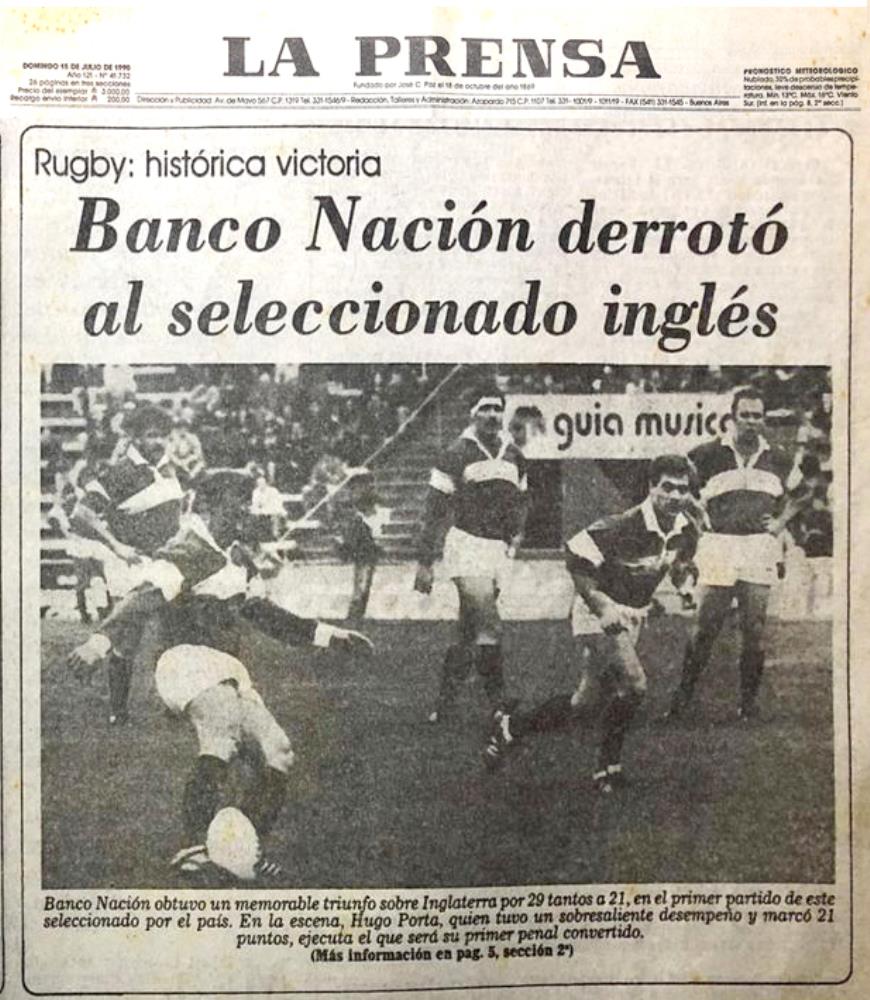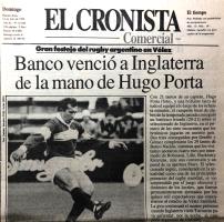Galería de Imagenes Así los distintos medios gráficos hicieron eco del gran triunfo de Banco Nación sobe la selección de Inglaterra. En esos años los medios gráficos representaban el principal contenido de información, junto con la radio, de la gente y a través de esta galería de fotos te mostramos como distintos diarios y revistas pusieron en sus primeras planas el logro conseguido por los “Bancarios” en el estadio de Vélez y las cámaras se quedaron con la imagen del capitán de ese equipo, Hugo Porta. Fotógrafo: Gentileza - Pilín Pérez, Coco Soto, Pablo Franchi, Fabio Gómez, Claudio Gentile y Rolo Etchegoyen. Archivos de la Revista el Gráfico, Diario la Nación y Diario Clarín Fuente: Federico Lemos - Rugby Champagne Galería de Imagenes