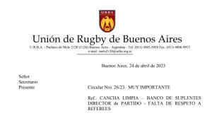Galería de Imagenes La URBA emitió una circular recordando a los clubes y a sus socios los términos del concepto "cancha limpia" especificando la cantidad de gente que puede estar en el banco de suplentes y los perímetros de la cancha. La Unión de Rugby de Buenos Aires insiste con el concepto "cancha limpia" y mediante otro comunicado recordó a los clubes y a su gente las cosas que no se pueden realizar a la hora de disfrutar un partido de rugby en Buenos Aires. Además remarcó que habrá sanciones para quiénes no cumplan con dichas medidas.La cricular es la número 26/23 y se llama "CANCHA LIMPIA - BANCO DE SUPLENTES - DIRECTOR DE PARTIDO - FALTA DE RESPETO A REFEREES".Hacé click acá y leé la circular de la URBA Fuente: Bautista Terrera Galería de Imagenes