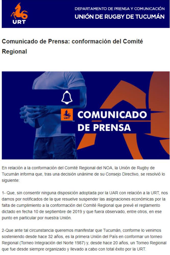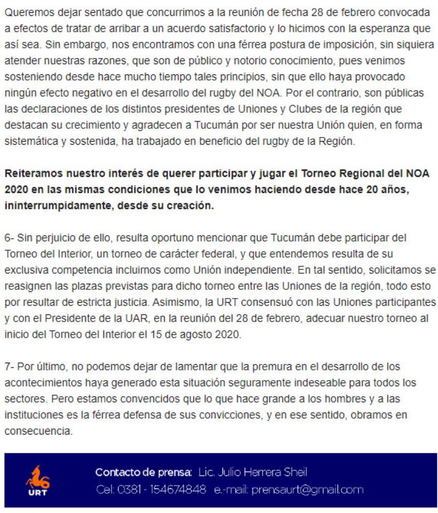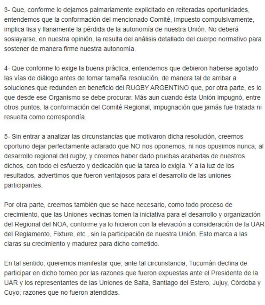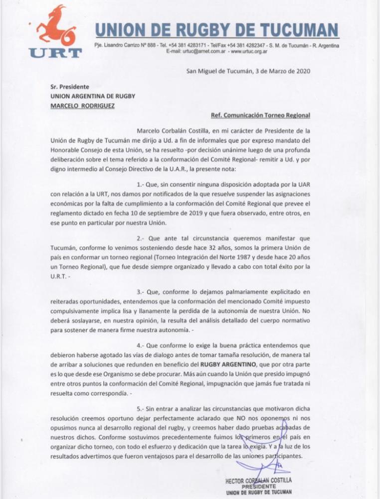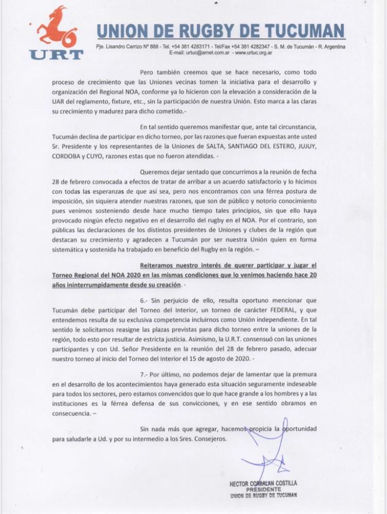 En una carta firmada por su Presidente, Héctor Corbalán Costilla, y con el aval de todos los clubes de la Unión Tucumana de Rugby, dejan en claro que no están de acuerdo con la formación de ninguna Comisión y en disconformidad con el armado del nuevo torneo (del que fueron excluidos por las Uniones de Salta, Santiago del Estero y Jujuy). No habría negociación posible para jugarlo.