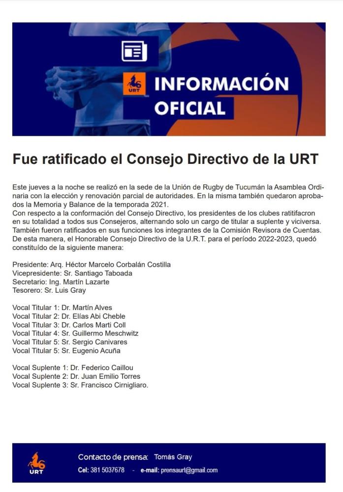 Galería de Imagenes En el día de ayer se llevó a cabo la asamblea general donde se confirmó a Héctor Corbalán Costilla como presidente y también se aprobó el balance del 2021. Acá te dejamos el comunicado de la unión: Galería de Imagenes