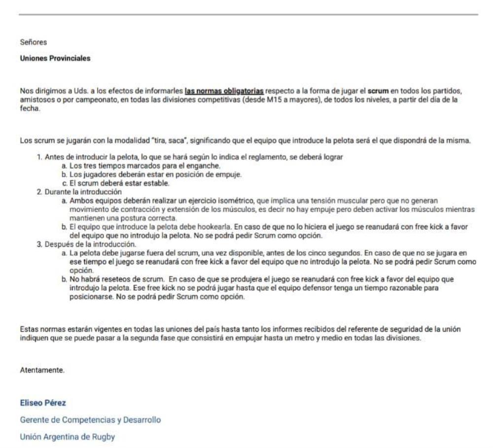 Galería de Imagenes A raíz de la aprobación y la vuelta a la actividad, la UAR tomó cartas en el asunto, y a través de un comunicado que le hizo llegar a las Uniones, dio a conocer los cambios que tendrá la formación fija, para que sea más segura, la cual comenzará a ser tira y saca en todas las categorías. Lee el comunicado completo: Fotógrafo: UAR Fuente: UAR Galería de Imagenes