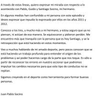 Galería de Imagenes El jugador de Saracens, y hermano de Santiago, se expresó luego de los tweets que se viralizaron de los jugadores de Los Pumas. Acá te dejamos la carta que escribió Juan Pablo Socino en su cuenta de Twitter por los tweets que se viralizaron de su hermano con contenido discriminatorio: Galería de Imagenes