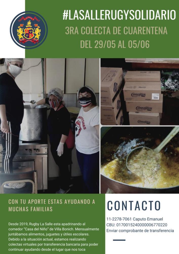 Galería de Imagenes Desde 2019, Rugby La Salle está apadrinando al comedor 'Casa del Niño' de Villa Bonich. Mensualmente juntan alimentos, juguetes y útiles escolares. Debido a la situación actual, están realizando colectas virtuales por transferencia bancaria para poder seguir ayudando. Mensaje de La Salle:Arrancamos con la 3era colecta de #LaSalleSolidario para el Comedor Casa del Niño.Venimos de dos grandes movidas que esperamos superar con ayuda de todos.Para esta oportunidad agregamos nuevo material para compartir en redes y grupos de WhatsApp.Como siempre decimos, 50, 100, 1000 o lo que puedan es una gran mano para ese comedor que está ayudando a muchas familias gracias a nuestras colectas. CONTACTO1122787061 Caputo EmanuelCBU: 0170015240000006770220Enviar comprobante de la transferencia Galería de Imagenes