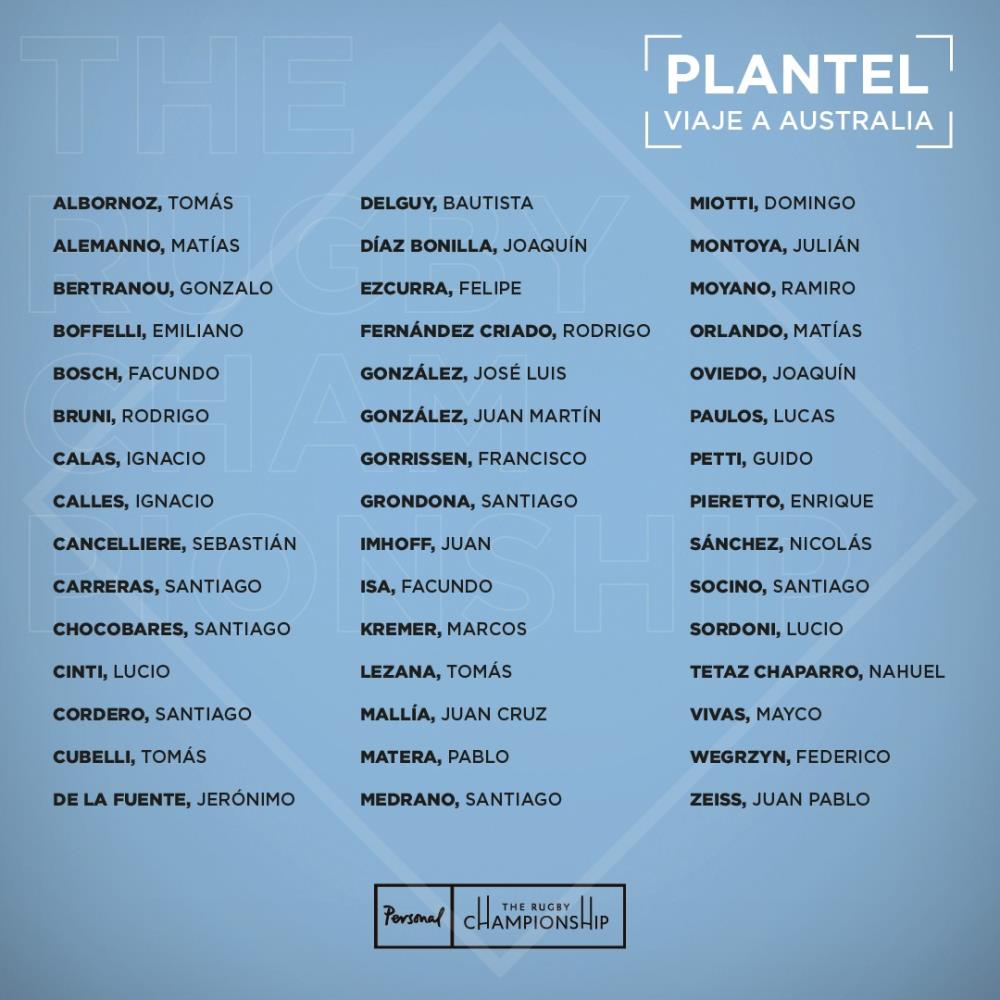 En tanto, el back formado en CUBA, Matías Moroni, que inicialmente iba a ser parte de la lista para el Personal Rugby Championship, sufrió un esguince en el ligamento lateral de su rodilla derecha y no viajará con la delegación.