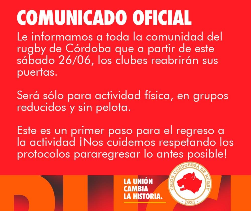 Galería de Imagenes A través de un comunicado, la entidad que regula el rugby en la provincia confirmó que los clubes reanudarán las actividades desde este sábado. Tras cerrar sus puertas por las medidas gubernamentales para bajar la creciente curva de contagio, los clubes de la Unión Cordobesa de Rugby volverán a la acción. Sin embargo, y durante un período, la actividad será solo física, en grupos reducidos y bajo un estricto protocolo sanitario. Lee el comunicado completo de la Unión Cordobesa de Rugby: Fotógrafo: Unión Cordobesa de Rugby Galería de Imagenes