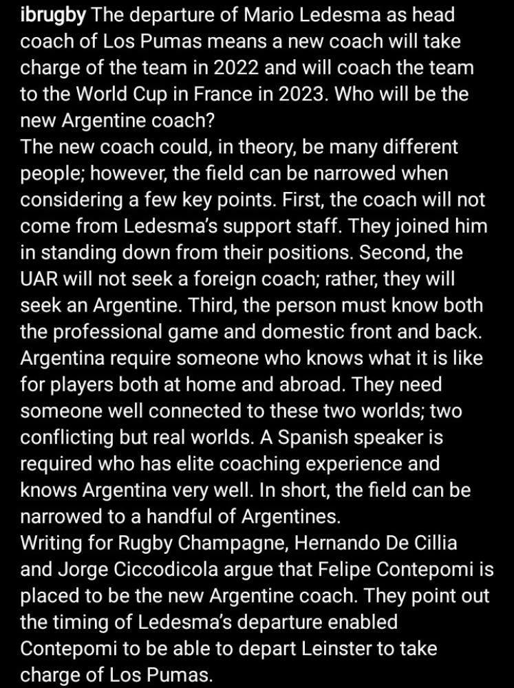 Contepomi corre con una amplia ventaja por sobre Gonzalo Quesada - a quien el público del rugby lo apoya masivamente - y hoy son los dos probables apellidos señalados para reemplazar y asumir como Head Coach de Los Pumas hasta el próximo mundial de Francia 2023; el único objetivo por el que Mario Ledesma había seguido en el cargo, "aguantando" hasta aquí y pensando en tener "su revancha": la del mundial de Japón, esa espina que le quedará clavada por siempre.